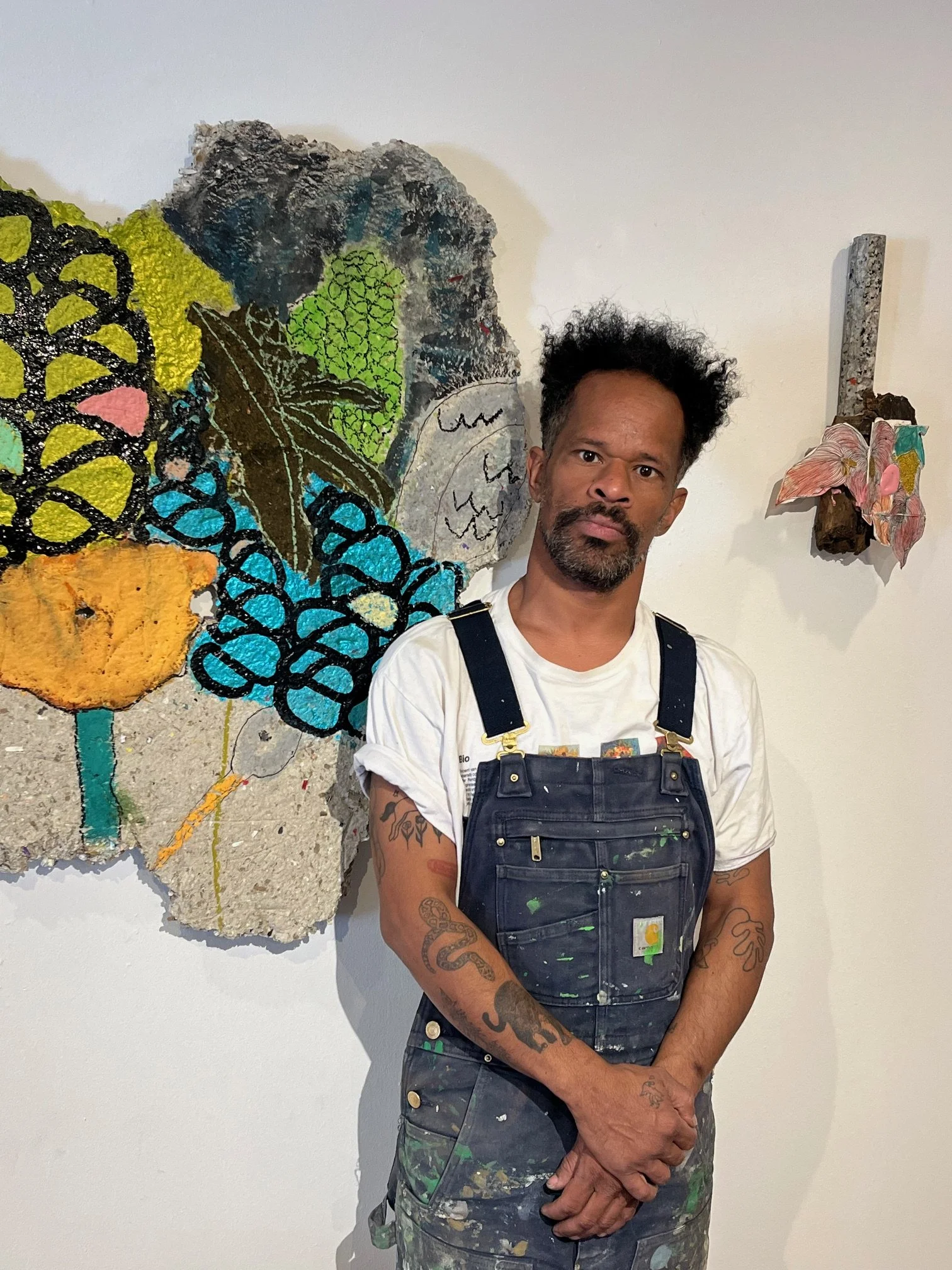 About the artist: Born in 1984, Jonathan Paul Jackson grew up in remote far West Texas before moving to Houston, where he continues to reside. From a young age, Jackson developed a deep love and passion for nature which continues to impact his art making practice. While Jackson has some formal art education and served as a studio assistant to several prominent Houston based artists in his formative years, he is largely self-taught, holding a high regard for experimentation. Jackson continues his work with nature-inspired imagery on non-traditional surfaces, drawing inspiration from the renowned Houston artist Jesse Lott (1943-2023), who utilized found materials for the basis of his artistic practice. Jackson has been and continues to be deeply inspired by nature; his scope is broad—from flowers seen on walks in his east side, Houston neighborhood to the geological forces that shaped our planet billions of years ago. Recently, Jackson has been developing a method of recycling paper, making paper so thick (up to one half inch) it becomes suggestive of walls, frescoes, or archeological remains. This paper varies in color, texture, and thickness, as bits of colored paper remain fully visible in the final painting. Through the process of recycling, Jackson takes his place amongst environmentally conscious artists, mindful of how their studio practices impact the environment. His arcadian imagery flutters somewhere between optimism and sorrow; optimism that even during times of great distress that nature can be a source of renewal, and sorrow for the animals negatively impacted by modern human’s ideas of progress.