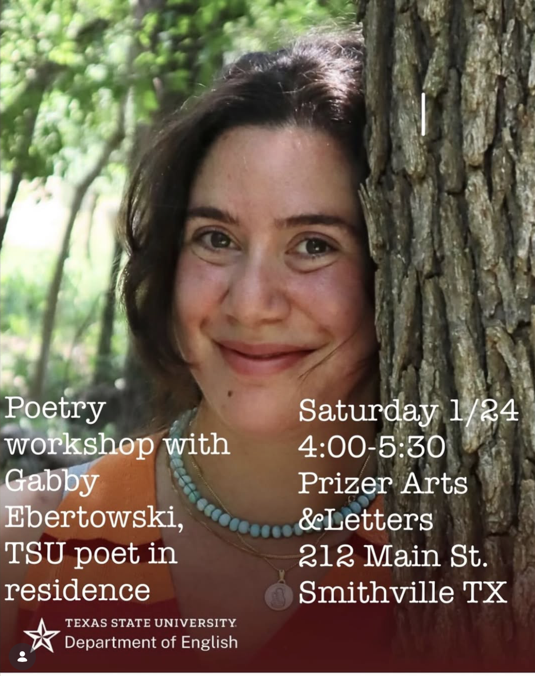 Gabby Ebertowski is a poet from Corpus Christi, TX. She is currently the 2025-2026 L.D. & Laverne Clark House Writer-in-Residence and teaches at Texas State University. Gabby will be hosting a poetry workshop at our location at 212 Main Street, Smithville, TX from 4pm to 5:30pm on Saturday, January 24th.